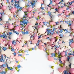 Toto se skrývá uvnitř: perleťové a růžové zaječí drobenky, třpytivé ovečkové drobenky v perleťové barvě, bílé čokoládové kuličky, růžové mini křupavé kuličky, jakož i konfety v šalvějové, bílé, indigově modré a růžové barvě.