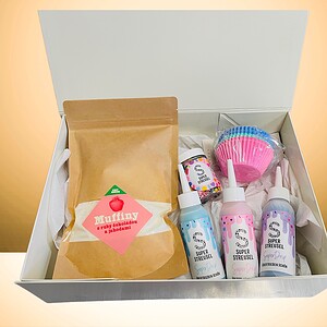 Dárková sada pro kreativní cukrářky se Superdrip polevami, muffiny s ruby ​​čokoládou, pestrobarevným posypem a košíčky na muffiny. Krásný dárek pro kreativní pečení, zabalený v kvalitní magnetické krabičce, provázaný mašlí.