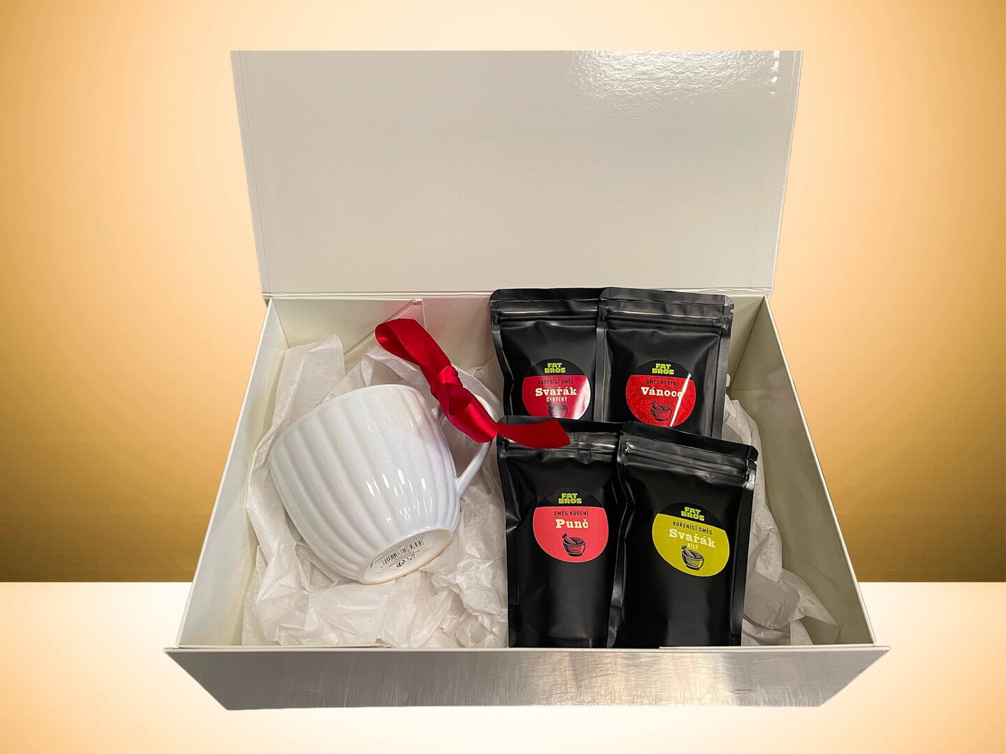 Dárkové balení hrníčku a našeho koření na horké nápoje – víno, punč i na horké džusy. Vánoční prášek vám provoní kakao nebo horkou čokoládu. Vše s bílým hedvábným papírem v lesklé pevné dárkové krabičce s uzavíráním na magnet. Perfektní dárek nejen na Vánoce.