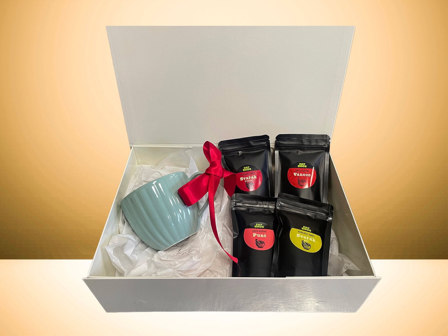Dárkové balení – luxusní hrnek a zimní kvartet v magnetické krabičce