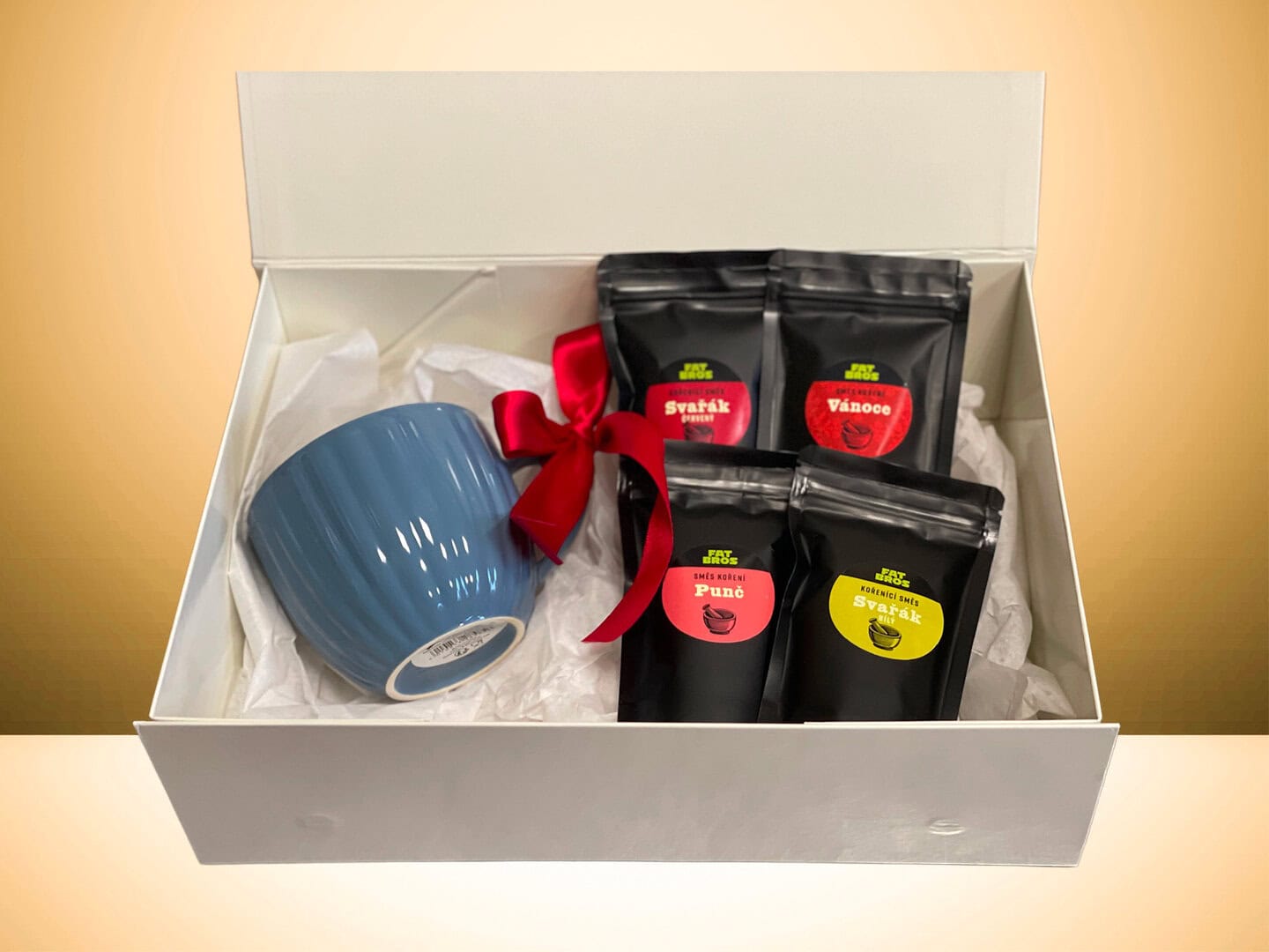 Dárkové balení hrníčku a našeho koření na horké nápoje – víno, punč i na horké džusy. Vánoční prášek vám provoní kakao nebo horkou čokoládu. Vše s bílým hedvábným papírem v lesklé pevné dárkové krabičce s uzavíráním na magnet. Perfektní dárek nejen na Vánoce.