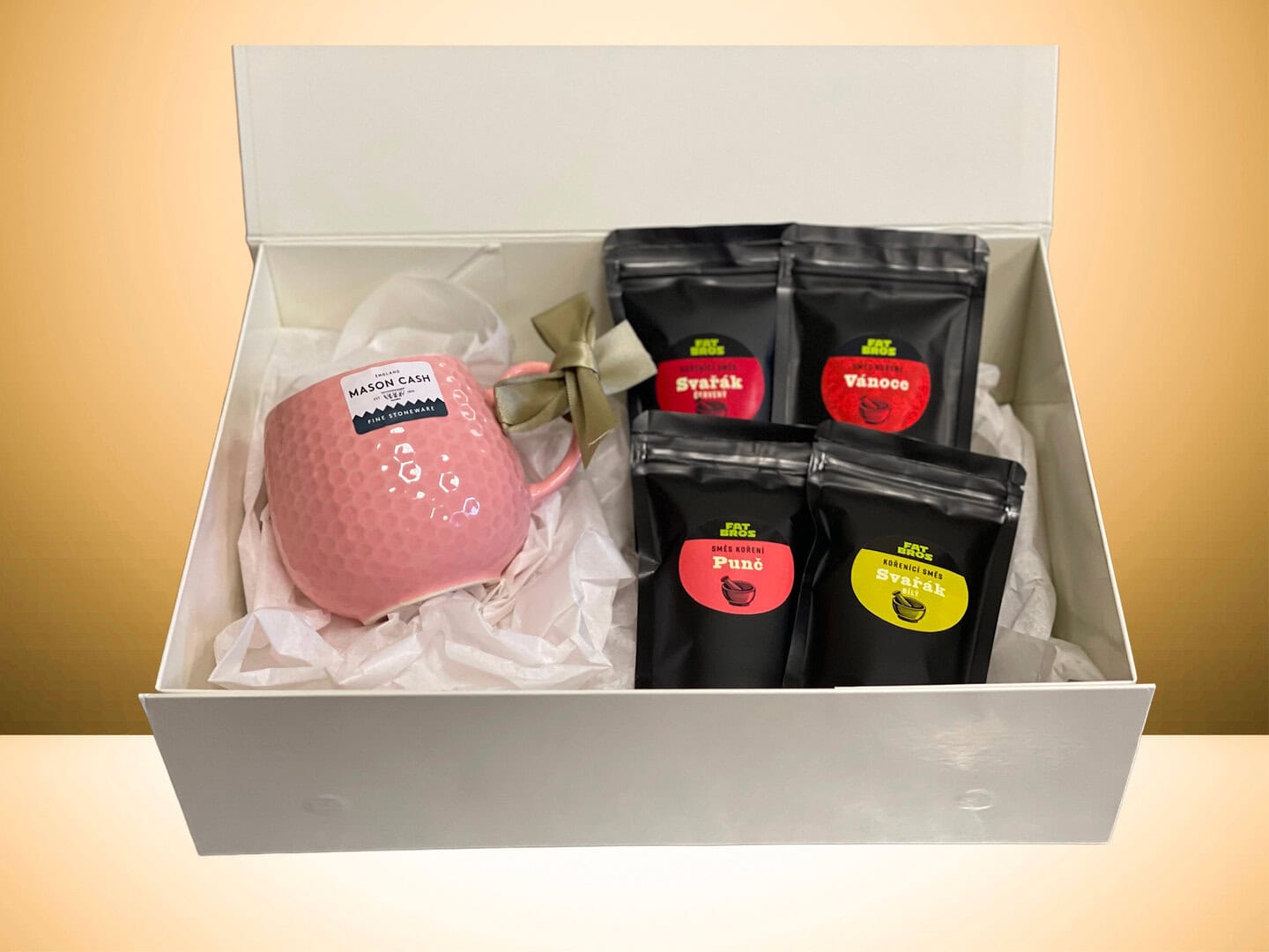 Dárkové balení hrníčku a našeho koření na horké nápoje – víno, punč i na horké džusy. Vánoční prášek vám provoní kakao nebo horkou čokoládu. Vše s bílým hedvábným papírem v lesklé pevné dárkové krabičce s uzavíráním na magnet. Perfektní dárek nejen na Vánoce.
