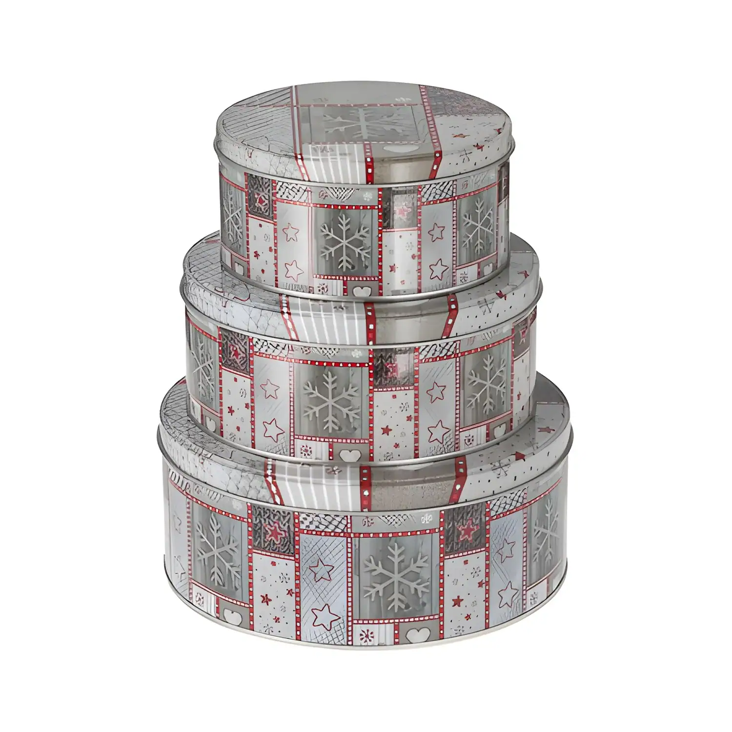 Vánoční dózy na pečivo v balení po třech kusech, ideální pro uchovávání domácích sušenek. Okrouhlé kovové formy jsou ideální pro sušenky, čokoládu a jiné sladkosti, které udrží vzduchotěsné a déle čerstvé.