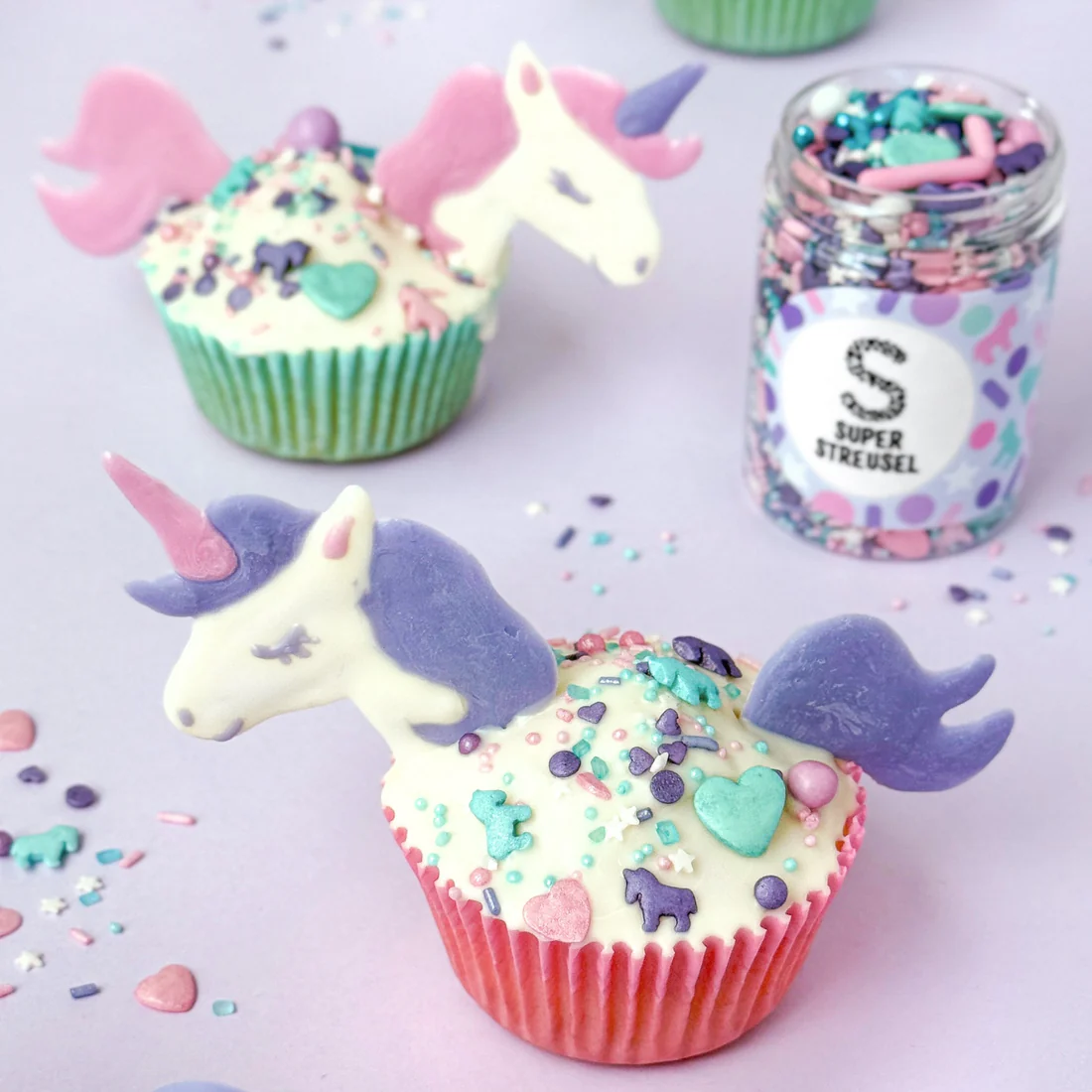 Pro dokonalý efekt doplňte figurky posypem s jednorožci a bílou, růžovou nebo fialovou polevou. Ozdobte si muffiny z naší výhodné sady nebo klasické vanilkové.