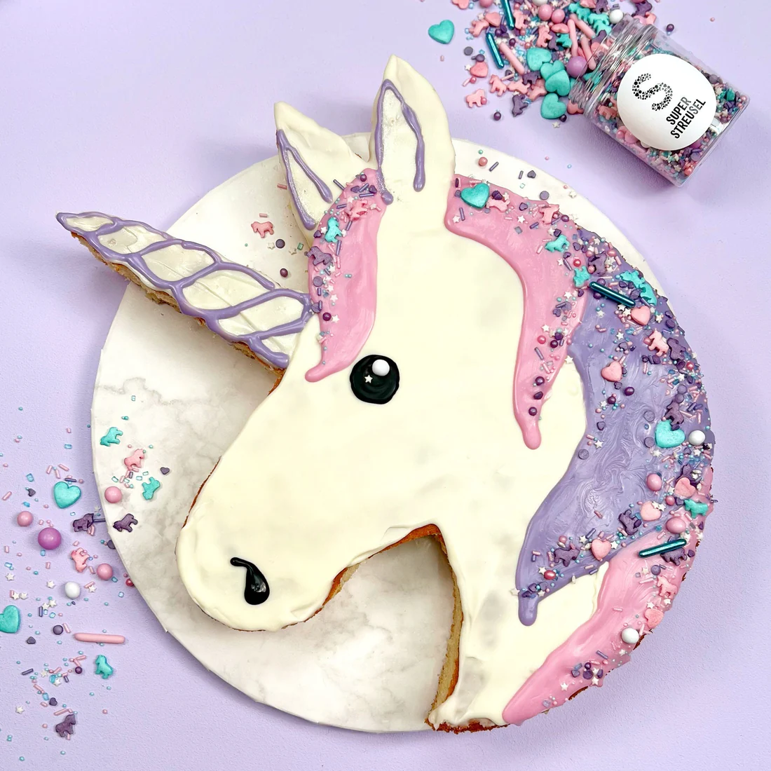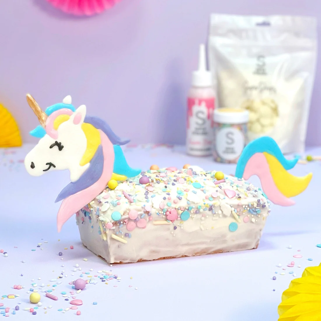 Sada na pečení veselých muffinů a bábovky. Tu můžete upéct v jakékoli formě – na hlavu jednorožce potřebujete kulatou formu o průměru 24cm. V sadě dále naleznete k dozdobení pestrobarevný cukrový posyp s jednorožci a 2 glazury. Na bílý základ můžete použít polevu z bílé čokolády nebo Superdrops. Veselou zábavu!
