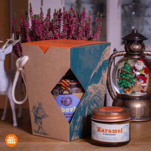 Bábovka s hořkou čokoládou a borůvkami v dóze, karamel v dárkové krabičce