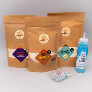 Sada na vánoční voňavé pečení pro děti. Přibalte jim do školy chutné muffiny nebo bábovku. Stačí zamíchat se 2-3 přísadami a upéct. Bez vážení, bez zbytků, bez stresu. Použili jsme nejlepší rodinné recepty a nejlepší suroviny. Ozdobte muffiny čokoládou, polevami a posypy. Jednoduchá poleva: 250 g moučkového cukru a 3 polévkové lžíce tekutiny (mléko, voda, citrónová nebo pomerančová šťáva).